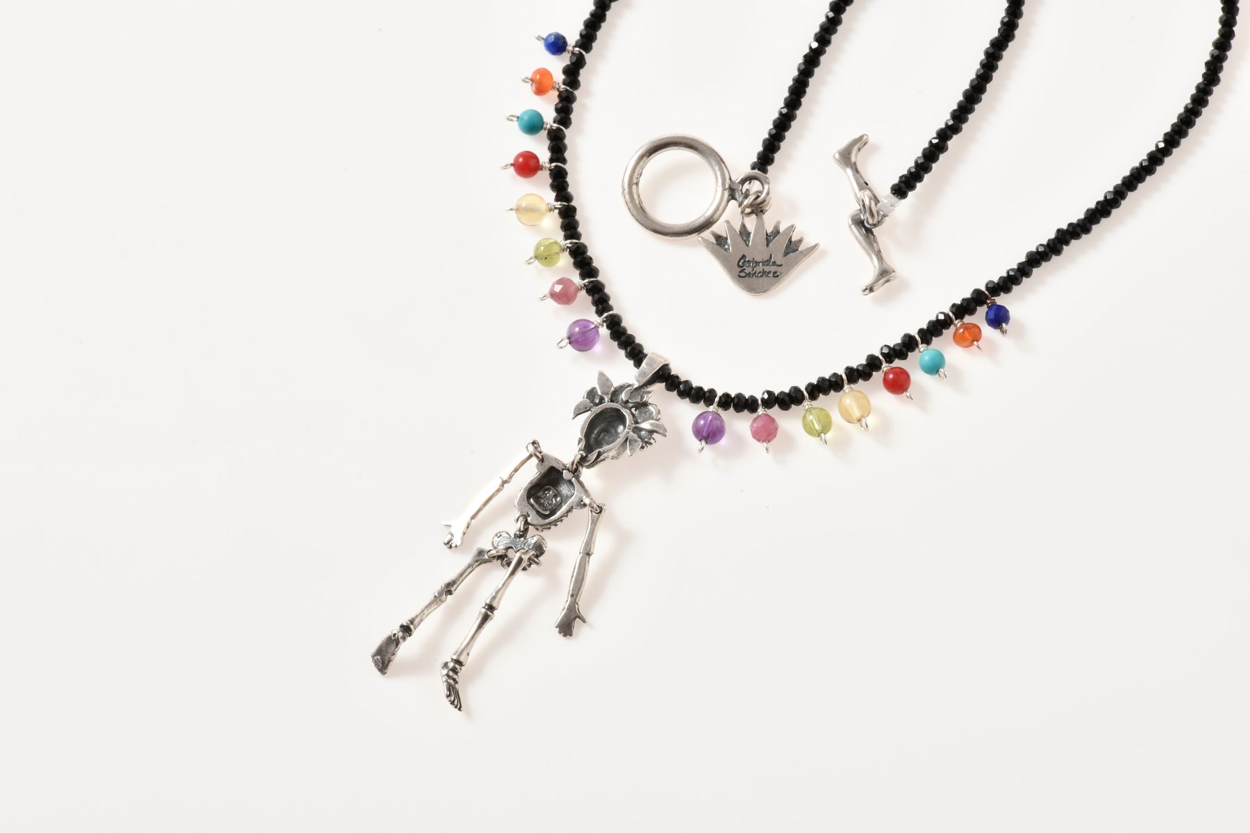 骨のパーツ一つ一つの細部にまでこだわったホネホネのカラベラピアスハードになりがちなモチーフがとてもキュートな仕上がりに。頭にお花をつけた女の子のカラベラいくつのハートを見つけられますか?ネックレス部分には贅沢にブラックスピネルのビーズを使用しています。▼素材SILVER925ブラックスピネルアメジストクンツァイトペリドットアンバーコーラルターコイズカーネリアン